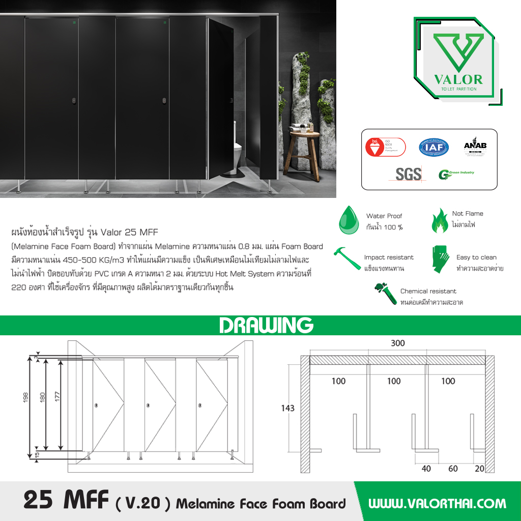 วัสดุมีความหนา 30 มม. ทำจากการขึ้นรูป FOAM BOARD ที่มีความหนาแน่นไม่น้อย กว่า 550 กิโลกรัม/ลูกบาศก์เมตร แข็งแรง กันน้ำ 100 ไม่เป็นสื่อลามไฟ ไม่นำไฟฟ้า ปิดผิว โดยการใช้แผ่นลามิเนต ความหนา 0.8 มม. ไร้รอยต่อ ระหว่างแผ่น ทนต่อการขีดข่วน ปิดขอบแผ่นผนังโดยรอบด้วย (EDGE PVC) เกรด A หนา 2 มิลลิเมตร ด้วยระบบ HOTMELT ที่ความร้อนไม่ต่ำกว่า 220 องศาเซลเซียส กลอนฝังรูปแบบสไลด์ ด้านหน้ามีสัญลักษณ์ ระบุสถานะการใช้งาน ผลิตด้วยเครื่องจักรที่ทันสมัย มาตรฐานจากเยอรมนี ควบคุมการผลิต ทุกขั้นตอน ภายใต้มาตรฐาน ISO 9001:2015